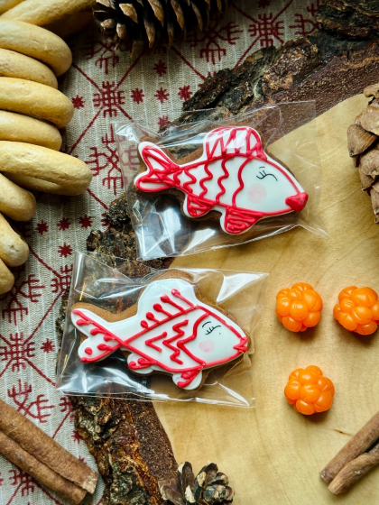 Вырезной пряник в виде фигурки , залит белой глазурью, расписан аутентичными карельскими узорами. Мордашка отрисована кистью. В ассортименте более 20 разновидностей фигурок. Все одушевленные фигурки отображают разные эмоции.