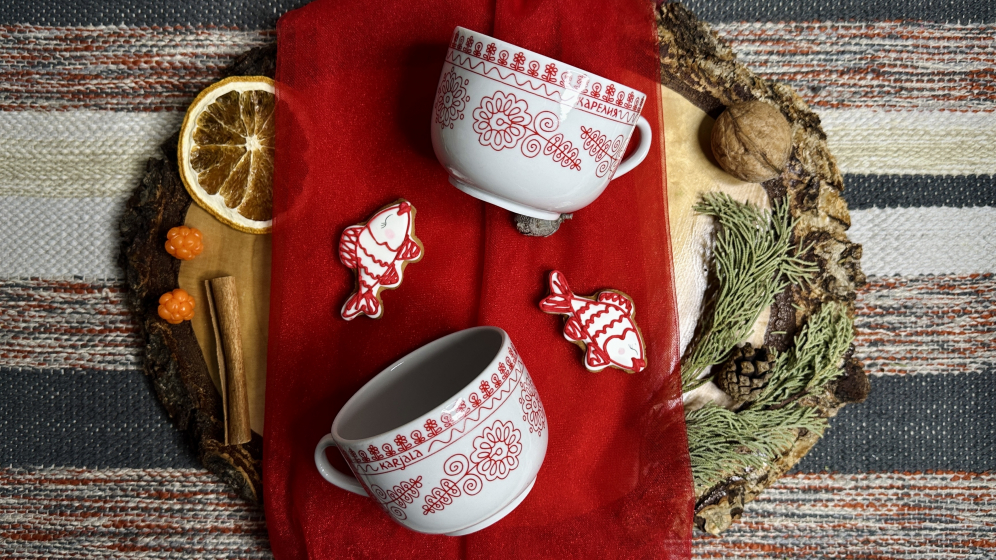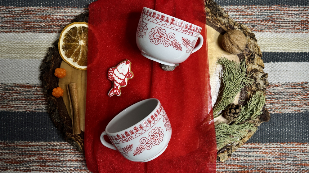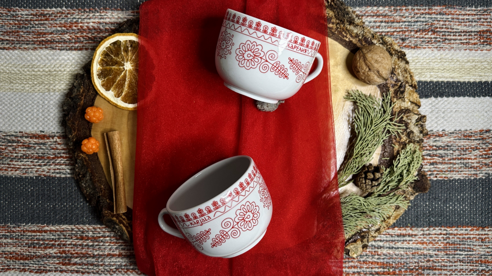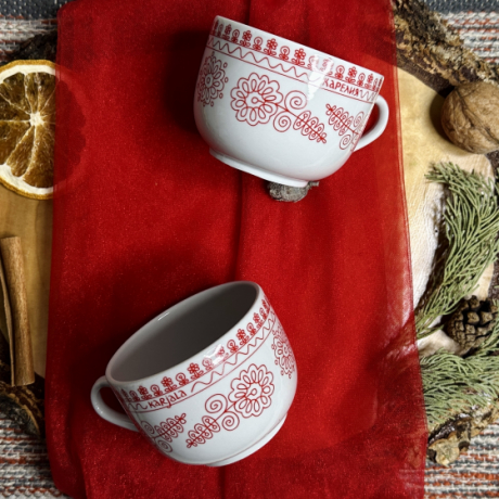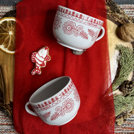 Изысканная фарфоровая чайная кружка, украшенная аутентичным карельским орнаментом. Метод деколи обеспечивает четкость и долговечность рисунка, сохраняя яркость красок. Это не просто посуда, а изящное дополнение к вашему столу, которое подчеркнет красоту традиционных закусок. Привнесите частичку северного гостеприимства в каждый прием пищи!